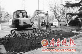 云岭路青岛大剧院对面的150平方米的绿化带被人毁坏擅自修建成了人行道,28日上午,崂山城管石老人中队执法人员依法予以拆除。 本报通讯员 赵英华 朱光磊 摄影报道