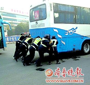 相信不少读者在电影中都看到过,拖拉机或者小轿车突然怎么也打不着火,几个人在后面吃力地推着它跑的镜头。但您在现实生活中见过这样的情形吗?11月30日上午,在省城经十路就上演了这样一幕,而在后面推车的,却是槐荫交警大队的民警和交通协管员。 11月30日上午7点50分左右,在济南经十路上,一辆大客车自东向西行驶到了市立五院路口。“车是辆蓝白相间的大型客车,从东边一路开过来,到了市立五院路口的东进口,打了个左转,想调头向东。”据现场的执勤交警徐磊介绍,当时,大客车想要调头,可是车子还没调转好方向,就突然熄了火,头朝南、尾朝北横在了路中间。 “不知道是哪里出现了故障,驾驶员打了好几次火也没有打着,就那么横在道路中间,时间达半分钟之久。”徐磊说,此时正值交通高峰期,车流量大,而且因为附近的五里牌坊停了电,信号灯也不能正常工作,这样,半分钟的时间就压了很多从西向东方向的车。 见此情形,徐磊判断是车辆出了故障,上前简单一问,知道了原委,赶紧喊来在此执勤的另外两名交警和4名交通协管员,7个人一起使劲把身体顶在大客车后面,让驾驶员在里面掌握着方向,一起发力,用了两分钟左右的时间,把大客车推到了路南的班车停靠点。 刚把客车推到路旁,还没来得及听驾驶员说声“谢谢”,徐磊他们就赶紧回到了工作岗位指挥起交通来。 “压了不少车,过了大约两个信号灯的时间,才恢复了正常交通。”徐磊说。