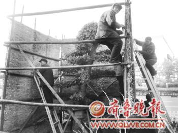 5日,在胶州湾隧道辅线,工人们正在为榔榆树围上挡风草垫。随着天气转冷,为确保道路两侧的珍贵树木能安全越冬,管理人员为它们穿“棉衣”、盖“新房”。