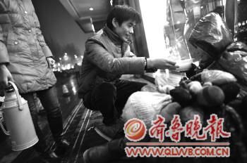 | 13日晚,济南救助站工作人员带着棉衣和温热的食物奔波在济南的大街小巷,送给不愿到救助站的流浪人员。图为花园路上,一位流浪的老人接过工作人员递来的一碗热粥。 本报记者 陈文进 摄 |
