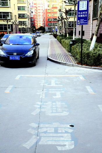 如今,这个问题借助一项新设施得到解决。在小区南北两条主干道的8个路口处,历城交警新设省城首个立体“让行港湾”,不仅在地面上有黄白蓝三色立体效果的文字提示,在路口处还有交通标牌提示。当两车相向而行时,北向行驶的车根据提示,往右打一把方向盘暂停到“让行港湾”内,为南向行驶的车让行。据居民反映,该“让行港湾”实施一周多来,效果十分明显,双向车顶牛导致堵车情况没再发生过。