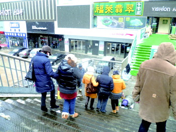 市民多相互搀扶着过天桥,以防摔倒。 记者 宋佳 摄