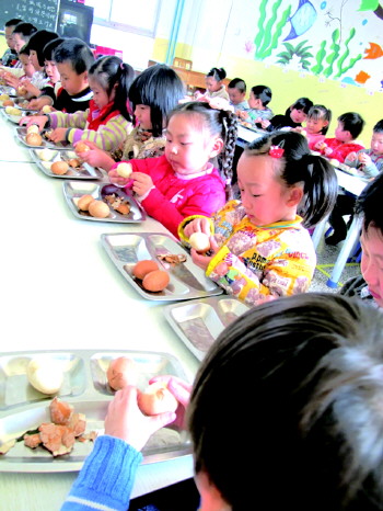 乐山里幼儿园的小朋友在剥鸡蛋。 校方