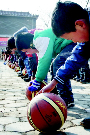 在志愿者的带领下,孩子们在学玩篮球。 本报记者 李军 摄