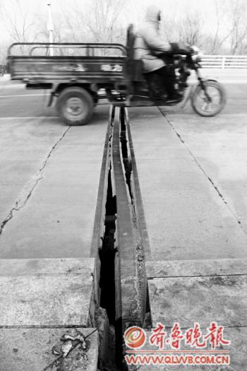本报12月24日讯(记者 常学艺) “东方红路岔河桥面上裂开了一个口子,不知道有没有危险。”24日,市民王先生拨打本报新闻热线称,他骑自行车经过岔河桥时发现,桥面有条裂缝,希望有关部门能前去维修,避免危险。 24日下午3时许,记者在东方红路岔河桥看到,西侧桥面上有一道十厘米左右宽的裂缝,桥栏杆处的石头也裂开了。桥上交通和平时相比并无太大变化,有机动车辆经过时会听到“咯噔”的声音。不少骑自行车和电动车的市民经过时会回头看两眼。 “我骑得比较快,电动车颠了一下,以为是压到什么东西了,回头一看竟是一条裂缝。”市民孙先生说,看到裂缝后心里也有些担心,有关部门应该对桥体检修。在附近居住的市民张先生说,他几天前就发现了桥上有裂缝,但裂缝好像并未扩大,也没发生过危险的事件。“不少从这过的人都很纳闷”。 “透过缝隙能看到下边有几个轴,连接得很紧,出现这种情况应该是正常现象,不用太担心,过些时间应该能恢复过来。”市民梁先生说,冬季温度过低,桥体可能出现了热胀冷缩现象。 记者看到,东方红路岔河桥东面也有桥体连接,但并未出现裂缝现象。随后记者在三八路、天衢路和大学路上几处岔河桥也并未发现有明显裂缝。