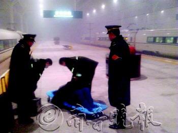 上图:28日19时48分,济南西站,为了转运一名羊水破裂的孕妇,G43次高铁多停5分钟才离站。在众人接力下,孕妇张影(化名)被火速送到医院,于21时40分平安产下一名男婴。 本报记者 徐延春 摄