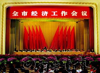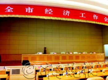 | 往年全市经济工作会议召开时,会场都摆放了鲜花。 (资料片) |  | 28日,一名工作人员从主席台走过,会场没有布置鲜花。 记者 张琪 摄 |