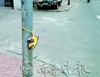 作品描述:谁家小孩的鞋子丢了,好心人把它捡起来,用绳子系在路边的铁杆上,方便失主发现。