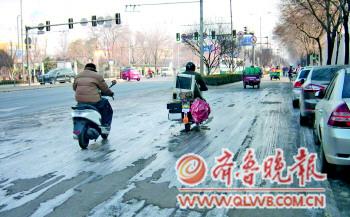 1月5日,在济南经七路上,市民小心翼翼地从马路上经过。近日天气寒冷,不少马路结冰成了溜冰场,给过往行人造成不便,希望有关部门及时清理。