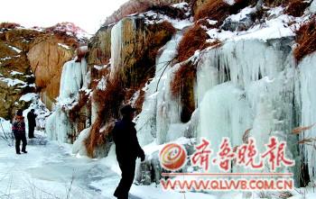 连日严寒,莱州马山出现了冰瀑。在马山脚下的郭家店镇返岭子村南一水库的石壁上,冰瀑形成了一幅东西长20米、高8米的天然水墨山水画,尤为壮观,冰瀑最厚处可达半米。