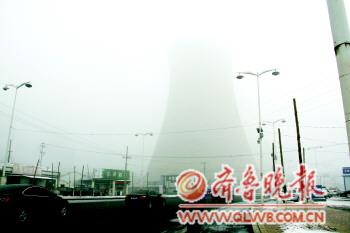 16日,运河经济开发区热电厂附近的雾气尤为严重,在运河大道上,不远处的冷却塔和其后的烟筒湮没在浓浓的雾气中,天上有雪粒不断飘落。