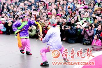 | 去年的毓璜顶庙会上精彩的海阳大秧歌表演吸引了众多市民。 记者 赵金阳 摄 |