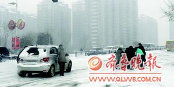 | 积雪经过冰冻和车辆辗压,振兴路运河桥处几成溜冰场,汽车开不上去,十多位市民在此帮忙推车。 本报记者 任洪忠 摄 |