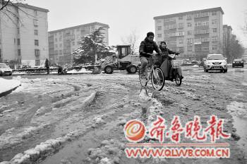 21日下午,张店潘庄小区附近道路上满是雪泥,市民在雪泥路上艰难前行。20日、21日两天,淄博出现大范围降雪,张店中心城区多条街道出现类似状况,给市民出行带来不便。 本报记者 王鸿哲 摄影报道
