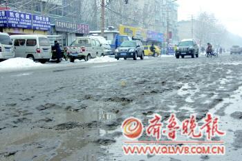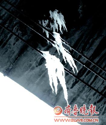 | 幸福街上,路上积雪成冰,道路崎岖不平。 本报记者 杜洪雷 摄 |  | 二环东路高架路下的冰挂直接吊在电线上,随时可能掉落,十分危险。 本报记者 周青先 摄 |