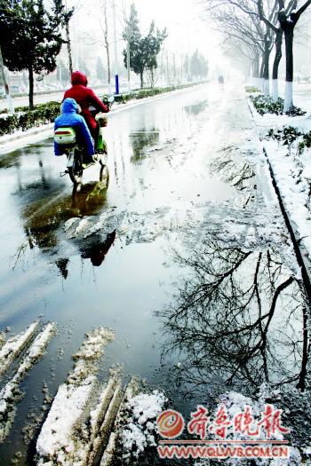 因德兴大道人行道上的雪未被清除,随着24日中午气温升高,雪渐渐融化,市民在“水中”前行。