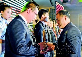 | 齐鲁晚报荣退员工黄汝清(右)为2012年度最佳敬业员工颁奖。 |