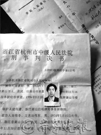 □新闻背景 1995年3月20日和8月12日,在萧山市(现为杭州市萧山区)发生抢劫并杀害出租车司机徐彩华、陈金江事件,警方认定是萧山籍陈建阳等5青年所为。在缺乏作案工具、指纹证据,主要依赖口供的情况下,1997年12月终审,4人被判死缓,1人被判无期徒刑。 2012年春,浙江警方在一次全省公安集中行动中,发现了一条涉及当年萧山抢劫杀人案的线索;2012年12月下旬,犯罪嫌疑人项某被抓获,通过审讯和指纹比对,被确认为是1995年3月20日萧山抢劫出租车案的犯罪嫌疑人。