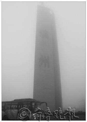 | ◥黄河大桥前的“滨州”坐标隐没在雾中。