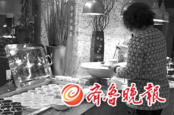 | 在济南一家酒店,客人正在取用食物,旁边有提倡节约的提醒。 本报记者 张頔 摄