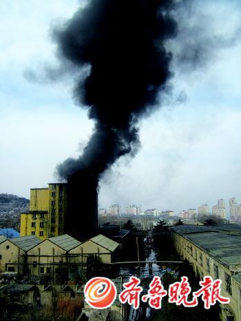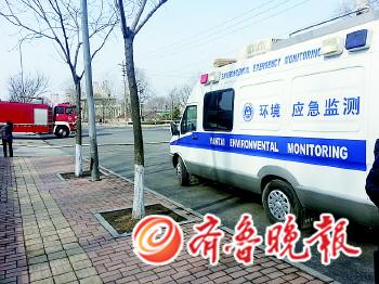 | 起火的车间冒出滚滚黑烟。 记者 王永军 摄 |  | 烟台市环境监测站的工作人员到达现场检测。 记者 于涛 摄 |