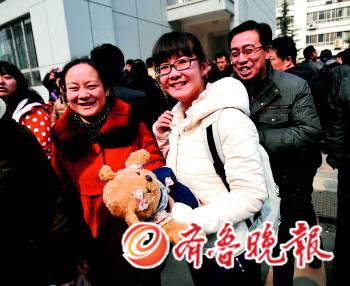| ◥23日,山大举办省内自主招生考试笔试。考生赵梦雨走出考场后拿到妈妈奖励的小熊。 本报记者 张中 摄 |
