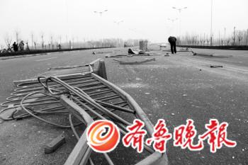 21日下午,大学东路上一段30多米的护栏被撞坏,据现场一位执勤交警称,暂未发现肇事车辆,将会查找监控录像调查取证。 本报记者 常学艺 摄影报道