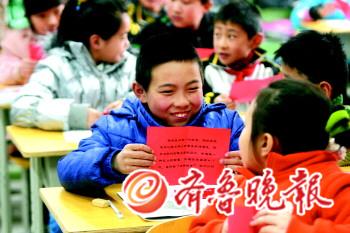 | 开发区第六小学,学生收到老师送来的红包,里面是一张激励学习的纸条。 记者 赵金阳 摄 |  | 班主任孙航老师现场发红包。 记者 赵金阳 摄 |  | 小学生收到“压岁言”很意外很高兴。 记者 赵金阳 摄 |