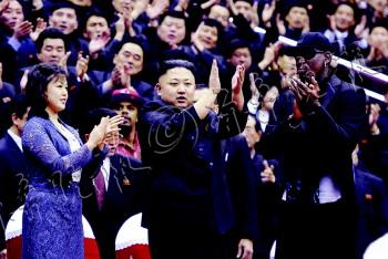 | 2月28日,朝鲜最高领导人金正恩偕夫人李雪主与来访的NBA前球星罗德曼并排就坐在主看台中央观看比赛。 |