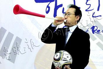 | ▲2010年7月6日,李明博在青瓦台举行午餐会,宴请从南非世界杯载誉归国的韩国男足,并试吹“呜呜祖拉”。 |