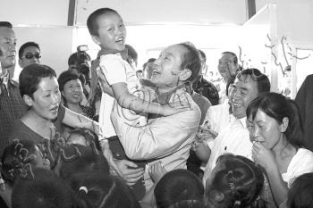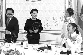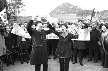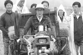 | 2010年3月4日,李明博和夫人在青瓦台同冬奥代表团共进午餐,席间戴着韩国速滑选手牟太范赠送的太阳镜,摆出滑冰动作。 |  | 2011年5月26日,李明博访问忠北忠州市水稻田,开着旋耕机插秧。 |  | 2008年5月30日,李明博抵达中国四川地震灾区都江堰的临时学校并拥抱小朋友。 |  | 2月14日,在韩国首都首尔,李明博夫妇搬离青瓦台总统府。 |