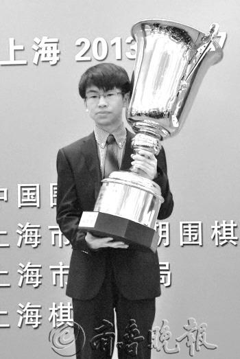 | 3月7日,第七届应氏杯颁奖典礼在上海举行。图为冠军范廷钰举起又大又沉的应氏杯冠军奖杯。 |