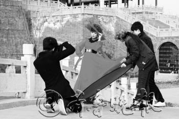 11日,户外白云飘飘,温度适宜,吸引很多人到景区拍照。图为下午4时许,一对情侣在董子文化街内拍照。 本报记者 常学艺 摄影报道