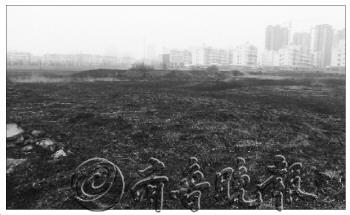 | 黄河二路渤海十九路南面空地的芦苇被烧,图为芦苇燃烧后留下一片灰烬。 本报记者 刘涛 摄 |