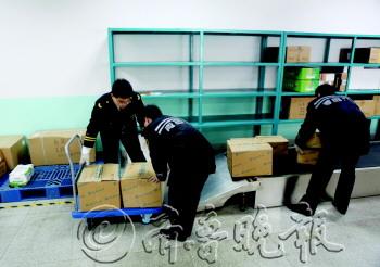 为了落实快递新规,减少货物的破损,日前,交运速递公司引进了传送带,客户快递的货物几乎全程都由机器运输,只在最后环节由工人搬上车。