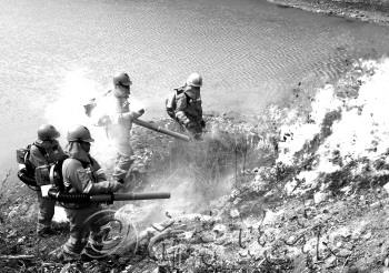 进入春季,又到了风干物燥、火情多发的季节。23日上午,济宁市森林公安局消防应急队专门进行了一场消防演练,十余名队员身穿专业防火服,在模拟的火情现场,用专业灭火器扑救“大火”。 本报记者 马辉 摄