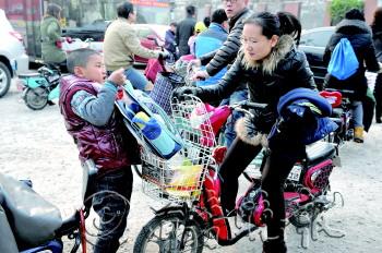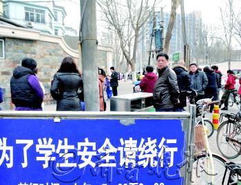 | ▲胜利大街小学门前,家长在等待接孩子。 本报记者 张中 摄 |  | ◥送孩子上学、接孩子放学,往往是全家总动员。 本报记者 张中 摄 |