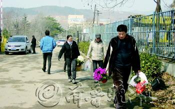 3月31日,市民拎着鲜花去芝罘区殡仪馆祭扫。 记者 柳斌 摄
