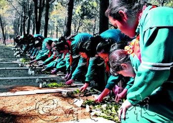 4月2日,在英雄山烈士陵园,来自济南市各界的扫墓队伍络绎不绝。很多中小学生和烈士亲属赶来献花,向烈士表达自己的一份哀思。图为制锦市小学的孩子们为烈士敬献鲜花。