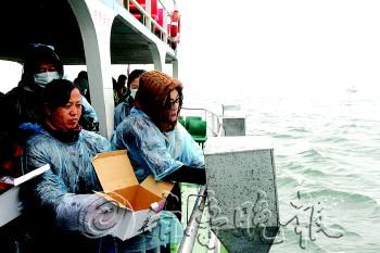 ◥去年春天的一次海葬,逝者亲属冒雨参加(资料片)。     本报记者 张晓鹏 摄
