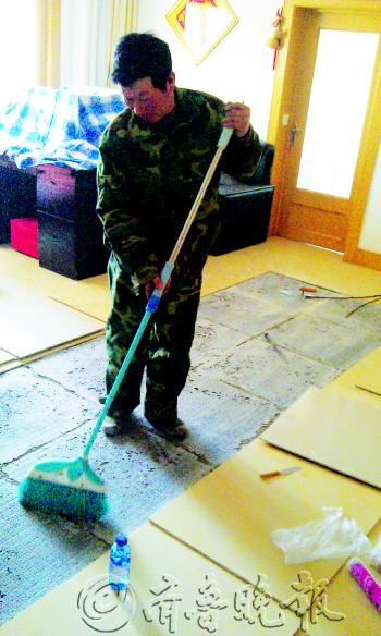 工人正在张女士家中更换新地板。 记者 苑菲菲 摄