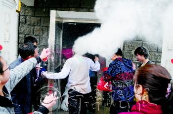 自述:结婚时朋友们一起闹新郎,满头面粉的新郎夺门“逃窜”。