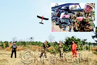 大图为民警在林地放飞航模固定翼飞机;右上图为航模直升机前端挂载了一个全自动摄像机。