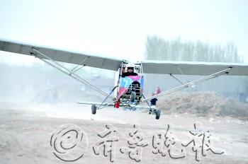 本报德州4月8日讯(记者 邵艺谋 实习生 李亚宁) 4月7日,山东科技大学泰安校区的王双剑等三名大学生,在德州成功试飞了他们历时半年设计制造的固定翼飞机,虽然受天气和场地影响,飞机只离地一米多,但已经实现了三个小伙子的“飞翔梦”。 7日下午两点,在王双剑的老家德州市平原县坊子乡王通村,王双剑和同学张帅、张成凯开始往试飞的地方运送机翼和支架。试飞的地点在村南头一条还没修完的公路上。听说王双剑制造的飞机要试飞,附近的村民都骑着自行车赶来观看,连路边田里浇地的村民都放下手中的活过来帮忙。在十几位村民的帮助下,不到半小时,机翼、尾翼操纵杆就全部安装调试好了。 而此时风力达到5到7级,飞行比较危险,大家足足等了将近四个小时。直到傍晚6点20分,风力稍减,在再次检查各种设备后,王双剑戴上飞行帽,坐进机舱系好安全带,按下了发动机启动键。 “轰轰轰……”发动机发出巨大响声,螺旋桨高速转动产生的风把路上的土吹得很高。加油、加速、调整姿势、拉动操纵杆……飞机的前轮慢慢离地,可就在两个后轮准备离地时,突然吹来一阵风,把即将腾空的机身吹歪。王双剑赶紧松开油门,同时放下操纵杆,飞机前轮又落回地面。 眼看着就要飞起来,却又被风搅乱,王双剑很不甘心。他又等待时机飞了两次,可都和第一次一样,因为风力太大,飞机前轮离地后有些飘而被迫停止。 晚6点40分,王双剑决定试飞最后一次,这一次,在螺旋桨的高速推动下,飞机前后轮先后离地。“飞起来了!飞起来了!”在场的所有人都兴奋地拍起手来。飞机向前飞行了将近十米,由于担心再有大风袭来,王双剑在大家的示意下将飞机降了下来。