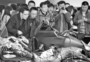 | 大气张扬的哈雷摩托吸引了许多追求时尚者的眼球。 本报记者 邱志强 摄 |