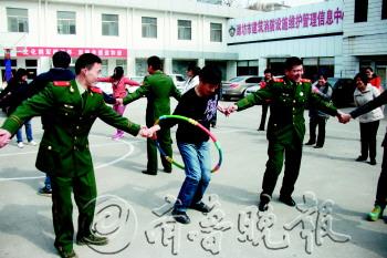 18日,在潍坊市奎文消防大队,来自潍坊学院的学生正和消防官兵一起做趣味运动。为了让大学生更加了解消防官兵的日常生活,中学街社区组织大学生到辖区内的消防大队,让学生和消防官兵举行了一场趣味运动会。 本报记者 孙国祥 摄影报道
