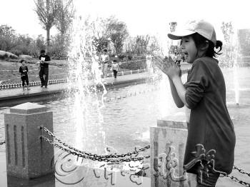 | 一位小朋友在北湖景区喷泉处欢呼雀跃。张林 摄 |