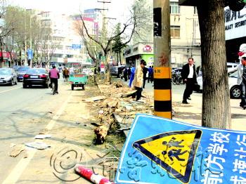 | ◥碗口粗的大树被撞倒在路边,指示牌也没能幸免。 记者 蒋慧晨 摄 |