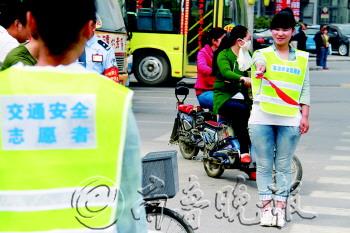 ▲7日上午,在聊城百货大楼路口,交通安全志愿者劝导行人遵守交通秩序。 本报记者 李军 摄