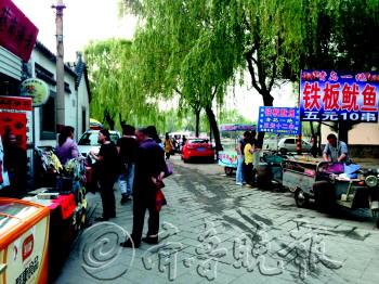 | 5日下午,王府池子南侧的观景平台几乎被饭桌和食客占满。 记者 殷亚楠 摄 |  | 5日下午,曲水亭街中段路东,有三个流动小吃车甚为扎眼。 记者 殷亚楠 摄 |